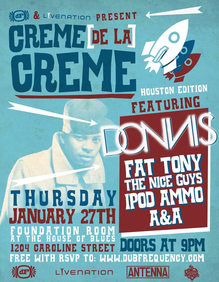 Donnis is coming through town as part of his “Creme de la Creme” tour. Opening up for the Atlanta MC, will be hometown badasess, Fat Tony, The Niceguys, Ipod Ammo and A&A. Show is FREE. Yes, you don’t have to pay money, but you are asked to RSVP here. It’s going down in the Foundation Room at the House of Blues this Thursday, January 27. Doors at 9 PM.