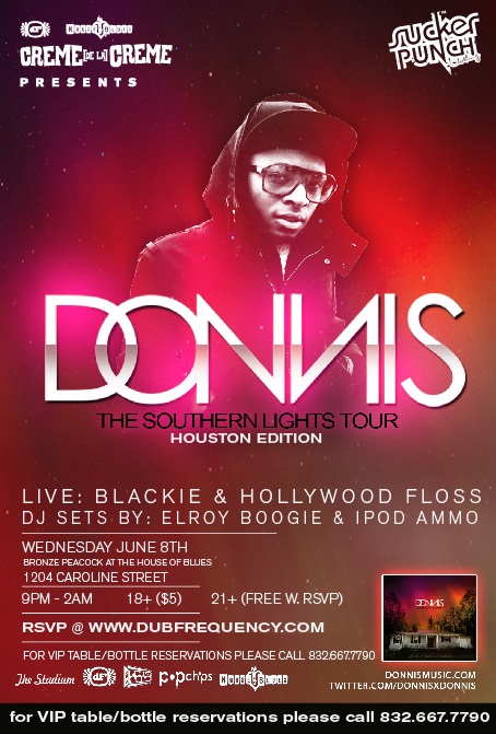 Creme de la Creme is back in Houston this Wednesday, June 8th with Donnis! Fresh of the release of his new mixtape Southern Lights, Donnis is hitting the road to showcase new tracks. The mixtape has features and production by CyHi Da Prynce, XV, Young Dro, Needlz, The Cataracs and more, so make sure to go grab it from Karmaloop.com. Catch opening performances by B L A C K I E and Hollywood Floss with DJ sets by Elroy Boogie and Ipod Ammo!
